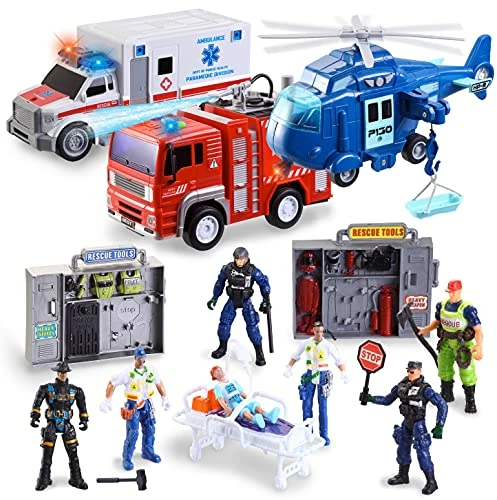 - COMPREHENSIVE SET. Our city emergency vehicle toys include 1 Ambulance, 1 Fire Engine Truck, 1 Rescue Helicopter, 1 medical stretcher, 1 weapon box, 1 rescue tool box and 7 action figures. The action figures come in many roles, including medical staff, patients, policemen and firefighters. Turning on the lights and sounds of every vehicle can simulate rescue scenes, which is very suitable for children’s pretend play.