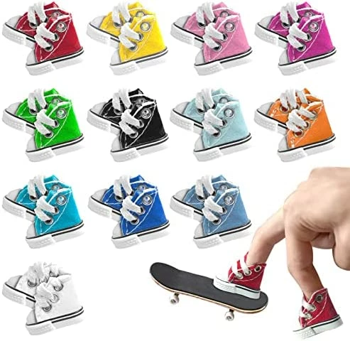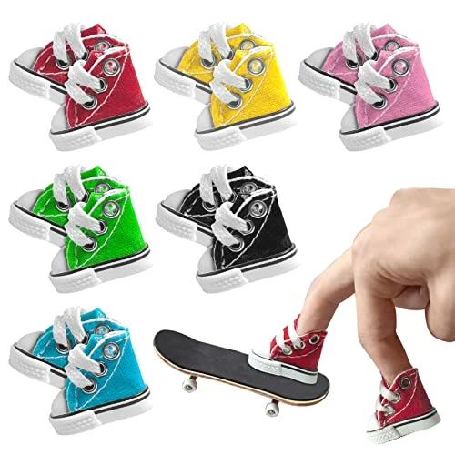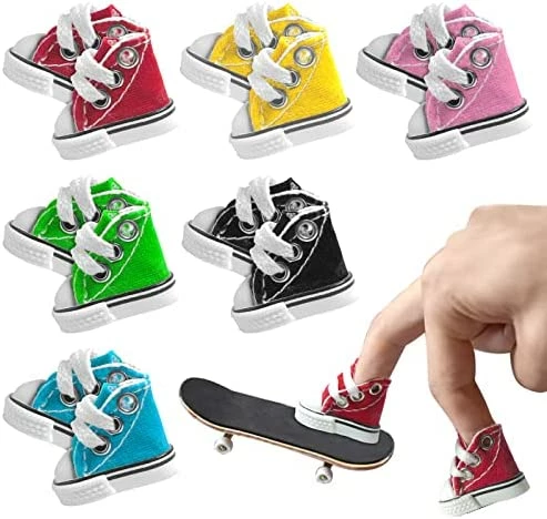 - γ6 Pairs Mini Finger Shoesγ6 pairs mini shoes for skateboard in six different colors, blue, red, yellow, pink, green and black. You could choose the color you prefer to play with your finger skateboard. Apart from these mini shoes has bright colors and white shoelace, these finger shoes are designed to the shape of sports shoes. And the hand-made mini finger shoes are cute and cool, which could attract other kid’s attention.