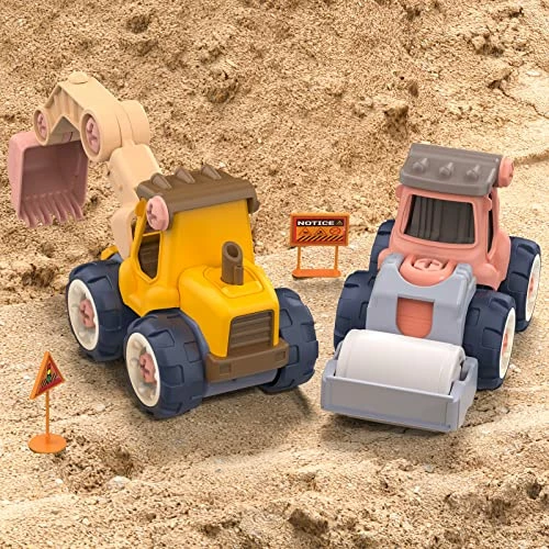 These are very cute construction vehicles. Theyβre not too small and not that big. They come put together. Younger toddlers can play with them if you keep them assembled and keep an eye on them to make sure they donβt end up taking it apart and swallowing a screw. However unlike most put together trucks Weβve owned, these screws have been staying put, even with all the movement theyβve been going through. This set also feels more sturdy and durable than the other sets weβve gotten. As your toddler gets older, they can have fun taking them apart and putting them together. These would make great beach toys. My toddler likes them, but he seems to prefer the trucks that look more accurately like the real trucks and also the more traditional colors. As he gets older, it may be different. I will pull these out again in a couple of months.