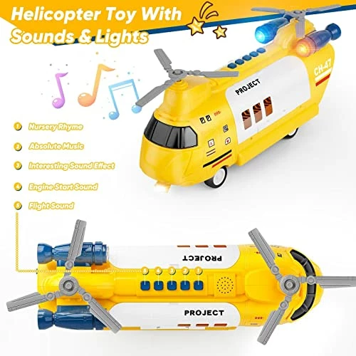 - Airplane Toy With Spinning Propellers – The spinning propeller of this toy helicopter is the highlight to catch your little one’s eye, which is made from soft rubber material, kids will not get hurt or pain if touch it when working. High quality ABS material helicopter and die cast alloy toy trucks, BPA free and non-toxic, 100% safe for kids and environment.