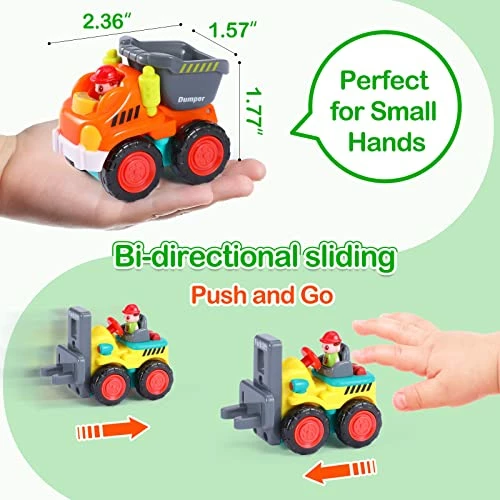 - ?Construction Car Toys: 6Pcs Mini Vehicle car toys for boys includes Excavator, Bulldozer, Dumper Truck, Cement Mixer, Forklift, Road Roller. 1 year old boy toys car work like the real trunk work, help kids learn about different tool vehicles. Vehicle truck toys playset in big quantity, enable kids to play together, develop their social and communication.
