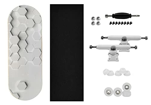 - GRAPHIC DECK FINGERBOARD COMPLETE || Premium, heat transfer graphic fingerboard complete. The “Raised Hexagons” edition includes the PROlific Maple deck with true skateboard quality, real-wear graphic, 34mm Prodigy Trucks in White Colorway with premium O-ring tuning, 61A Pro Duro Bubble Bushings in White, polyurethane bearing wheels in White, one sheet of PROlific foam tape, mini filing board, 4 Upgraded Stainless Steel Lock Nuts, 8 black screws, and 1 tool