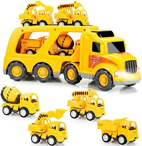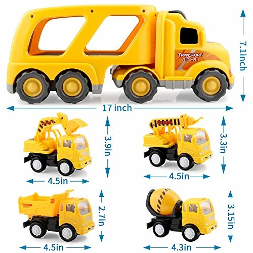 - Construction Trucks Set: The toy pack includes 4 small construction trucks – crane, mixer, dump, and excavator truck. The set comes along with a friction-powered carrier truck as well to carry the trucks. It is a perfect toy set for kids of 3 years and above.