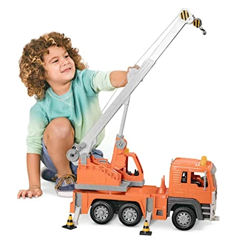 My son loves all things construction, so this crane truck was a no-brainer! The toy is massive- around two feet long, and another two feet tall with the crane fully extended. It easily dwarfs most of his other toys. The crane hook is made of metal and is quite heavy. This is good for sturdiness and realism, but be mindful that it can be a slight bit hazardous if it were to swing into your child’s head. It probably won’t do any lasting damage- just a few tears and maybe an ouchie on the forehead.Overall the truck is pretty sturdy, but I do have a couple of minor gripes. On this toy, there is a bar at the front and bottom of the cab. This bar is to grab the hook when not in use. It lasted about a week before snapping off as my son impatiently yanked on the cord. On our garbage truck made by the same manufacturer, the spring loaded door broke and now hangs limply on the side of the cab. My son still loves playing with the toys, and these minor quality issues wouldn’t prevent me from buying again (and didn’t stop me from buying other toys in the line) but it’s worth mentioning.The truck has plenty of pieces that move, such as an extending boom, a crank to raise and lower the hook, and folding stabilisers. The doors to the cab open and close. The truck doesn’t come with any people figures, but my son has no problem re-purposing other toys to serve as crane truck drivers. The cab also has lights and sounds to add to the immersion of play. There’s even a horn on the steering wheel that honks! The sounds are not obnoxious, though- just the sound of an engine running at a reasonable volume. (And the batteries seem to last forever.) My son’s favourite part is probably the four removable traffic cones. He loves to set them up and then tell mommy and daddy to watch out for the construction site. It’s very cute!This is easily one of my boy’s favourite toys, and a day doesn’t go by that he doesn’t play with it. Given the size and features, I would’ve expected to pay double or even triple the price for this toy. As it stands, even with some minor durability issues, this is a toy that is well worth the money.