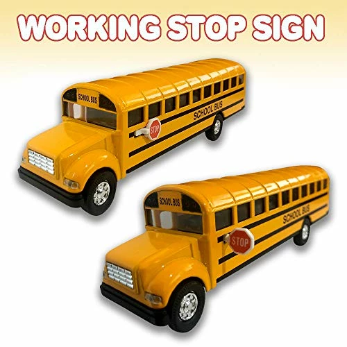 - SUPER COOL FEATURES: The yellow school bus toy of every kidβs dreams! This diecast bus toy stands out with its realist look, functioning stop sign that opens and closes, swinging front door, and solid rubber tires. Each bus measures a cool 7β long.