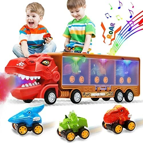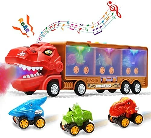- γMultifunctional Toys for Boys Girls ToddlersγThe kids toys for 2+ year old boy girl is designed with mist spray function, flashing lights, music and dinosaur roaring sound. Pressing the button on the top of the dino toy trucks will activate these functions, which is very attractive for kids. This toy cars for 3+ year old boys is designed with holder close lids on one side of the trucks to organize and display the dinosaur cars and other kids toys neatly