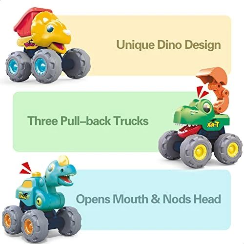 - ใPull-Back TrucksใUpdated version of monster truck. Push the button on the top of the truck and the dinosaur opens its mouth, the dino trucks will make children more excited and happier. All of three pull-back truck with big wheels, a long enough sliding distances will give your children infinite joy and imagination space.
