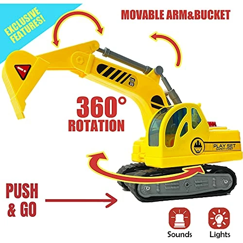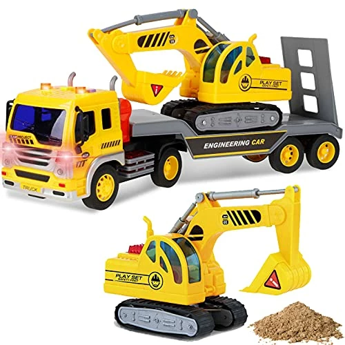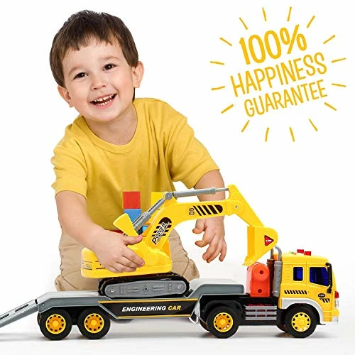 - FRICTION POWERED: Flatbed Truck and Excavator toys for boys. Just push the truck forward several times, then let go and watch the truck roll!