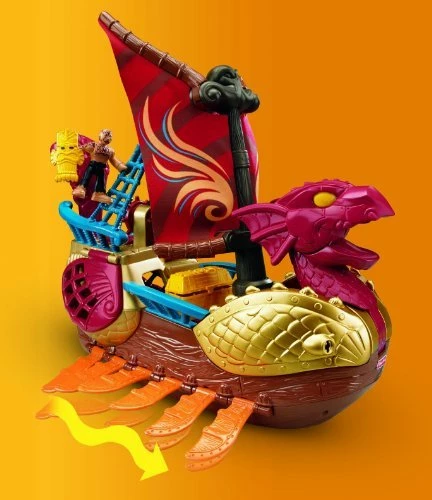 - The Imaginext Serpent Pirate Ship comes with a ship that looks like a serpent, two figures, three projectiles, a treasure chest, and two coins