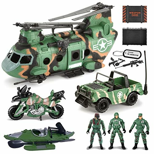 - SUPER VALUE PACK. Our pretend-n-play helicopter toy set includes 1 jumbo transport helicopter, 1 military truck, 1 kayak boat, 1 military motorcycle, 3 army men action figures, 1 weapon box, 1 name tag and various equipment figures.