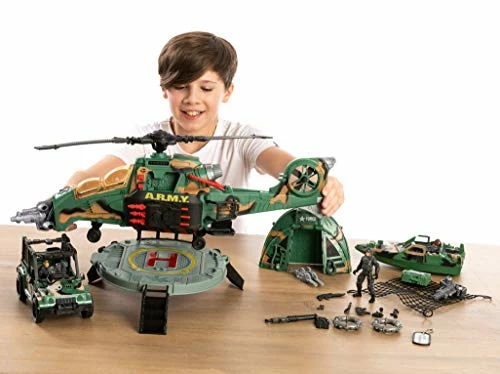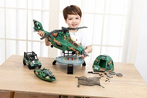- COMPREHENSIVE SET. Our super valued comprehensive military toy set includes 1 jumbo combat helicopter with lights and sounds, 1 military car, 1 military boat, 1 military tent, 1 landing platform, 3 military action figures, 1 name tag and various equipment figures.