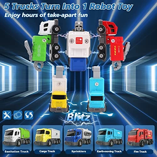 - STEM TOYS FOR KIDS- In the process of disassembly and assembly of the boy toys, which can exercise children’s logical thinking ability, motor-skill ability, and problem-solving ability, and can also cultivate children’s confidence in doing things, get rid of the bad habit of three-minute heat. Definitely a great Christmas gifts for boys. Before assembling the robot, children can push the 5 trucks to slide forward to play, after assembling, the toys for 5 year old boys can also move manually; the legs and arm joints of the toys for boys age 4-7 are movable, bringing immersive fun for kids.