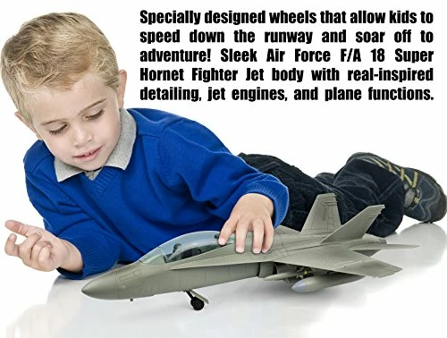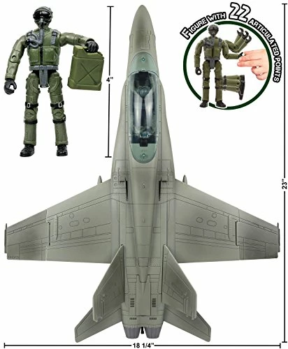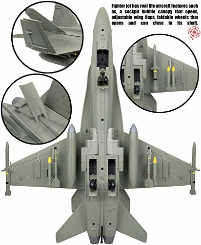 - Realistic & Fun: This fighter jet playset has real life aircraft features such as, a cockpit bubble canopy that opens, adjustable wing flaps, foldable wheels that opens and closes in its shaft. Aircraft measurements in inches; 22.5β Long from nose to tail, wingspan 18.2β and height of 6.2β inches.