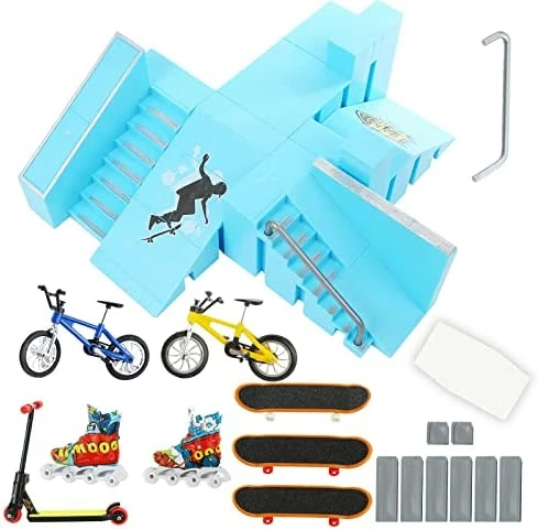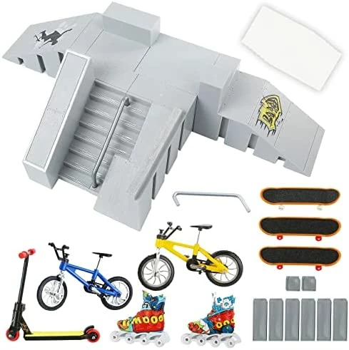 - ?This skate park kit finger toy set with 5 parts, made of 30 pieces, kids can combine as different scene accroding to their imagination. Your child can then choose from using the mini scooters, skateboards and bikes on the ramps to entertain themselves for hours of skating fun. Develop children’s imagination and creativity,this is also a very perfect education helper