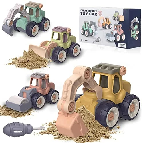 - 【 Take Apart Toys Sand Trucks Set 】 Construction toys include 4 kinds of trucks: Road Roller / Bulldozer / Excavator / Drilling Truck. The small take apart construction truck can better stimulate kids’ curiosity and provide hours of fun for them. The attributes of easy to build and take apart is friendly to kids to play alone.