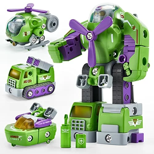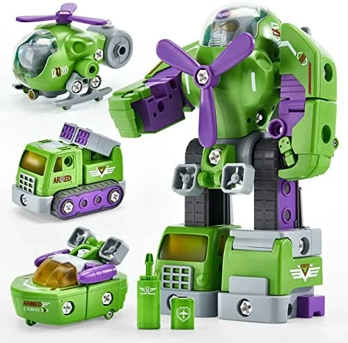 - γ3 Take apart Vehicles Transform into Big RobotγThis stem building toys playset includes air, land and sea vehicles (Fighter Aircraft, Missile Truck, Patrol Ship) plus a screwdriver and come with easy to follow instruction. They are toys for 3 year old boys girls and can be take apart and rebuild into 3 separate vehicles or a big robot at a time, which provide endless fun for kids to play and promote teamwork and patience.