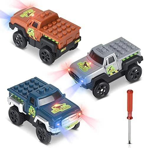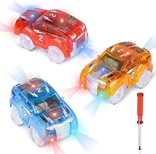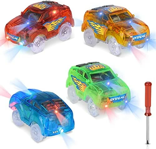 - ? [2 LED Light up Glow] Each of these track cars features 2 ultra-bright LED lights that emit bright colors, bright and colorful on days and nights. Racing track cars 2 lights keep the track glowing as it keeps going, making the car attention-grabbing and special. The kids will be attracted and make them feel happy. Each track car requires 1 AA batteries (not included)